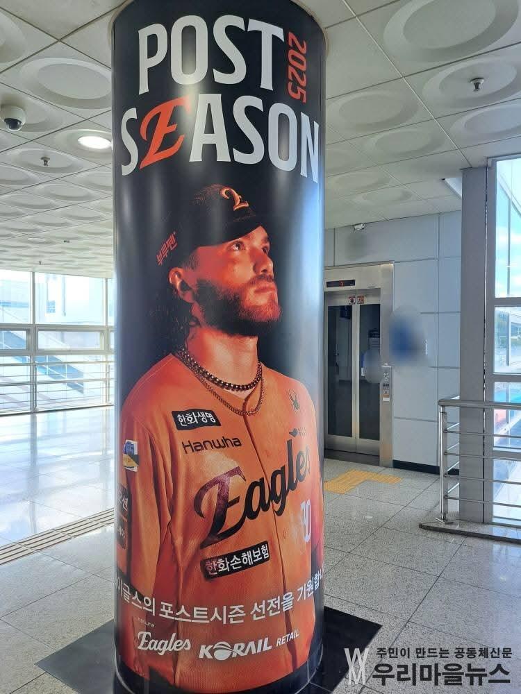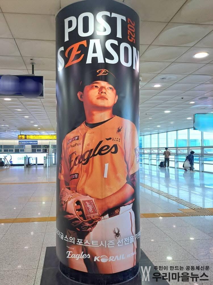 대전역 2층 기둥에 부착된 한화 선수들의 멋진 대형 사진이 있으며, 오늘 대전에서 승리를 기원한다.