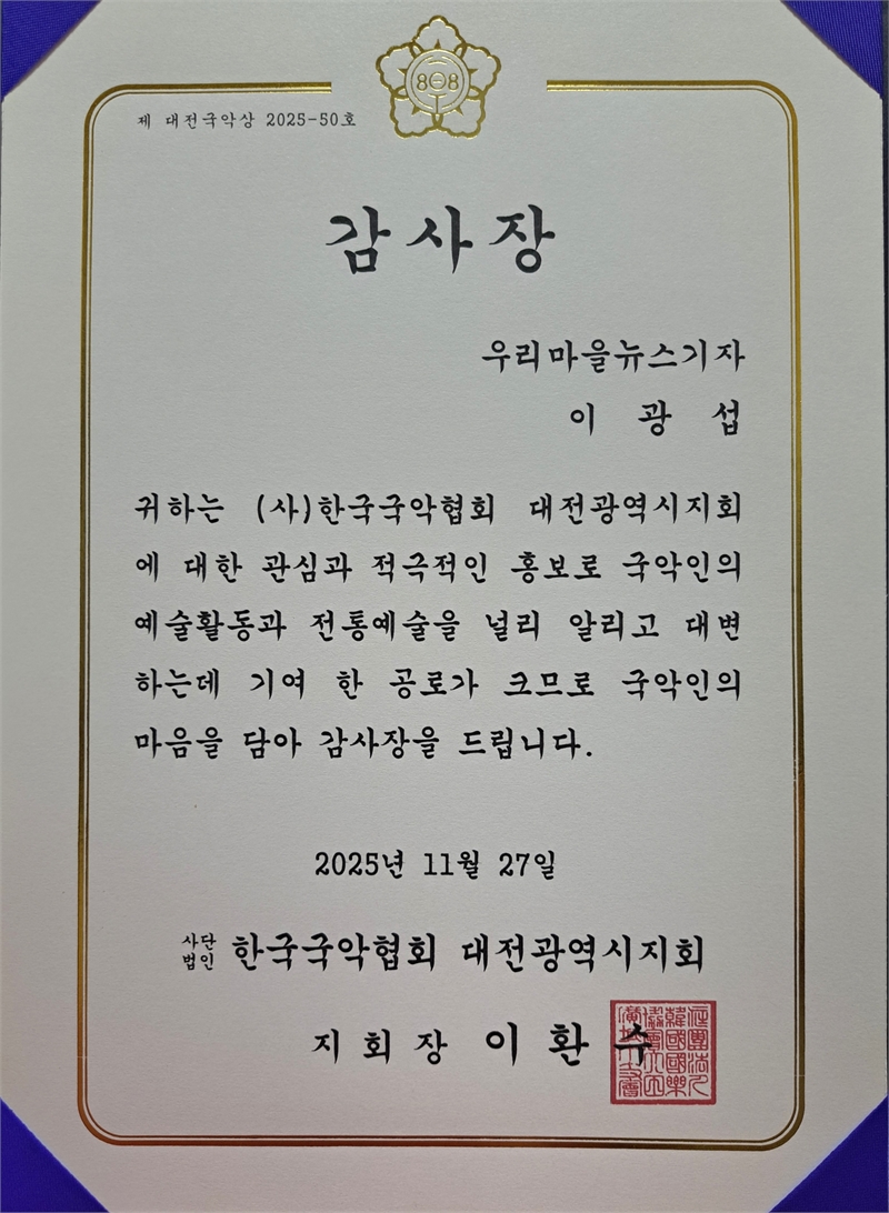 우리마을뉴스 이광섭 부장기자가 지역 전통예술 발전에 기여한 공로를 인정받아 사단법인 한국국악협회 대전광역시지회(지회장 이환수)로부터 감사장을 수상했다.