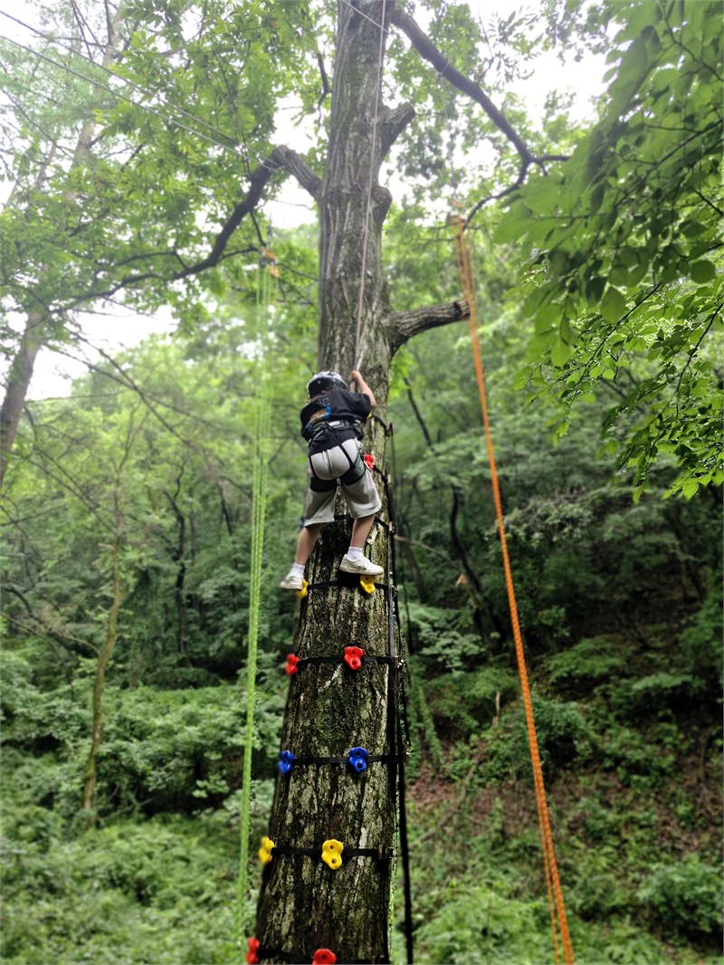 높은 밤나무를 몽키클라이밍으로 올라가는 어린이(사진: 온새미로숲학교)