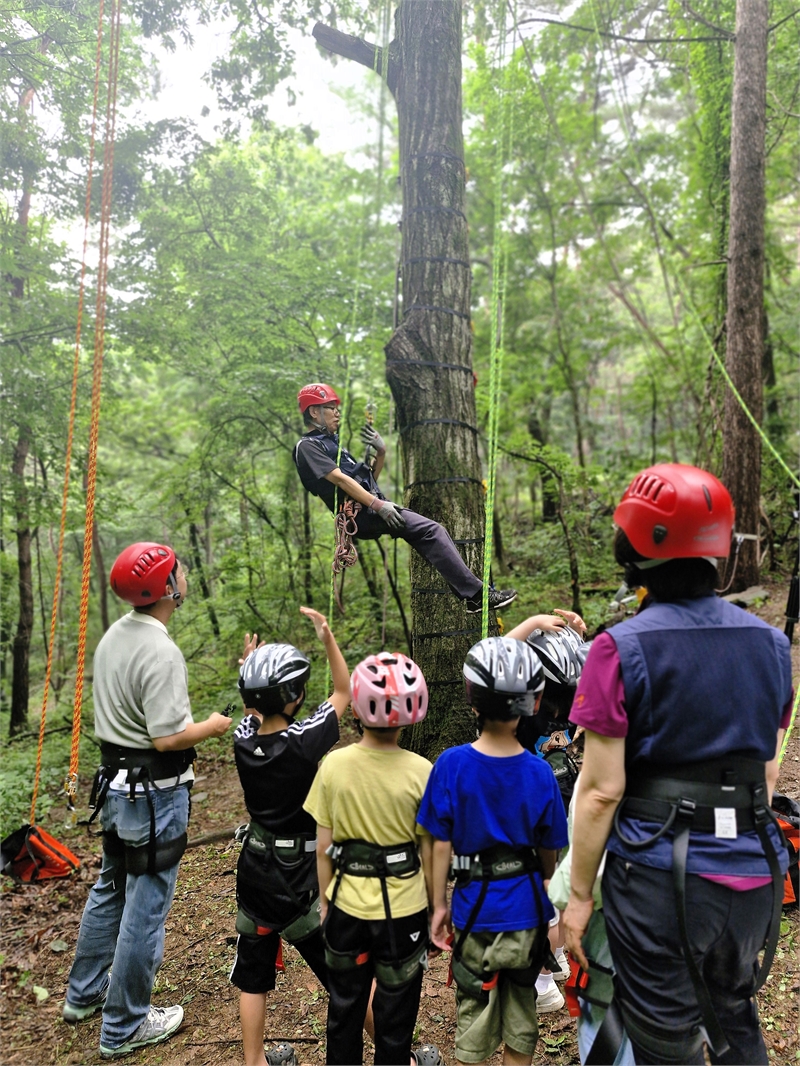 온새미로숲학교(대표 손이정)에서 참가 학생들에게 트리클라이밍을 안전하게 이용하는 방법을 설명하고 있다.(사진: 온새미로숲학교)