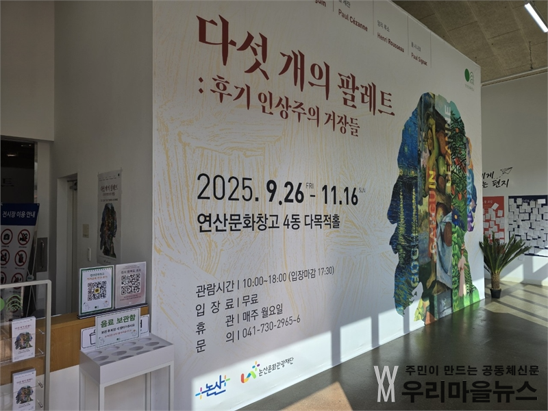 논산 연산문화창고에서 2025년 9월 26일부터 11월 16일까지 열리는 특별전「다섯 개의 팔레트: 후기 인상주의의 거장들」이 지역민들의 큰 호응을 얻고 있다. 이번 전시는 빈센트 반 고흐(Vincent van Gogh), 폴 고갱(Paul Gauguin), 폴 세잔(Paul Cézanne), 앙리 루소(Henri Rousseau), 폴 시냑(Paul Signac) 등 후기 인상주의를 대표하는 다섯 화가의 주요 작품 세계를 한눈에 살펴볼 수 있는 기회다.