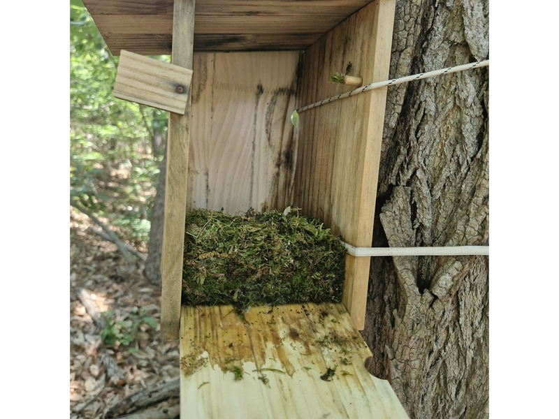 대청호 호반길 5코스에 연구용으로 설치한 인공새집과 번식이 끝난 둥지(2025년 6월)
