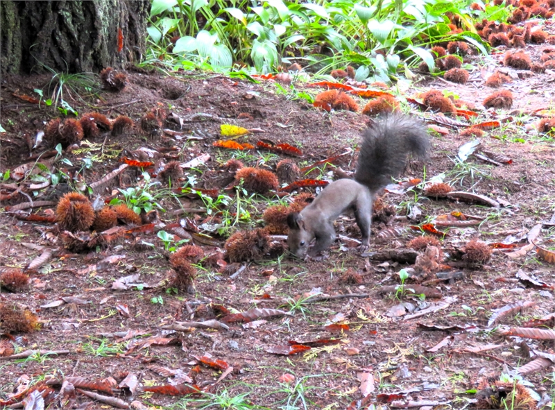 밤송이 사이에서 밤톨을 찾는 남이섬의 청설모(2025년 10월)